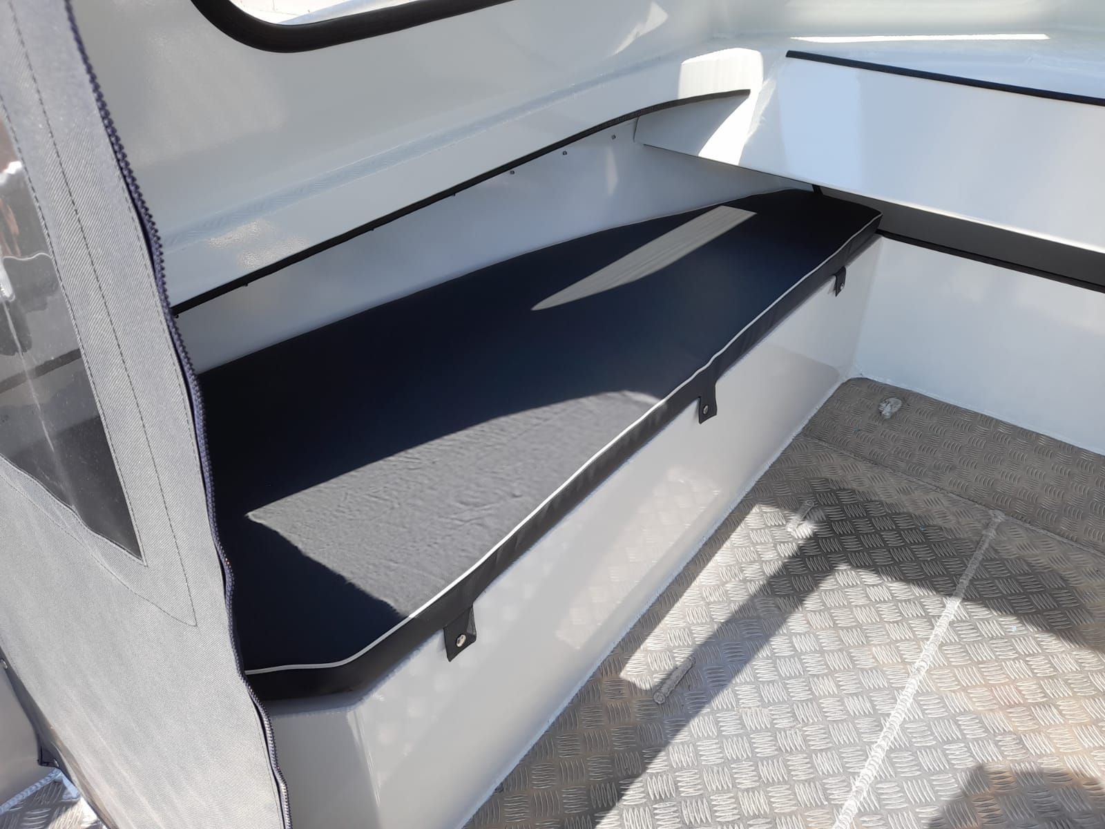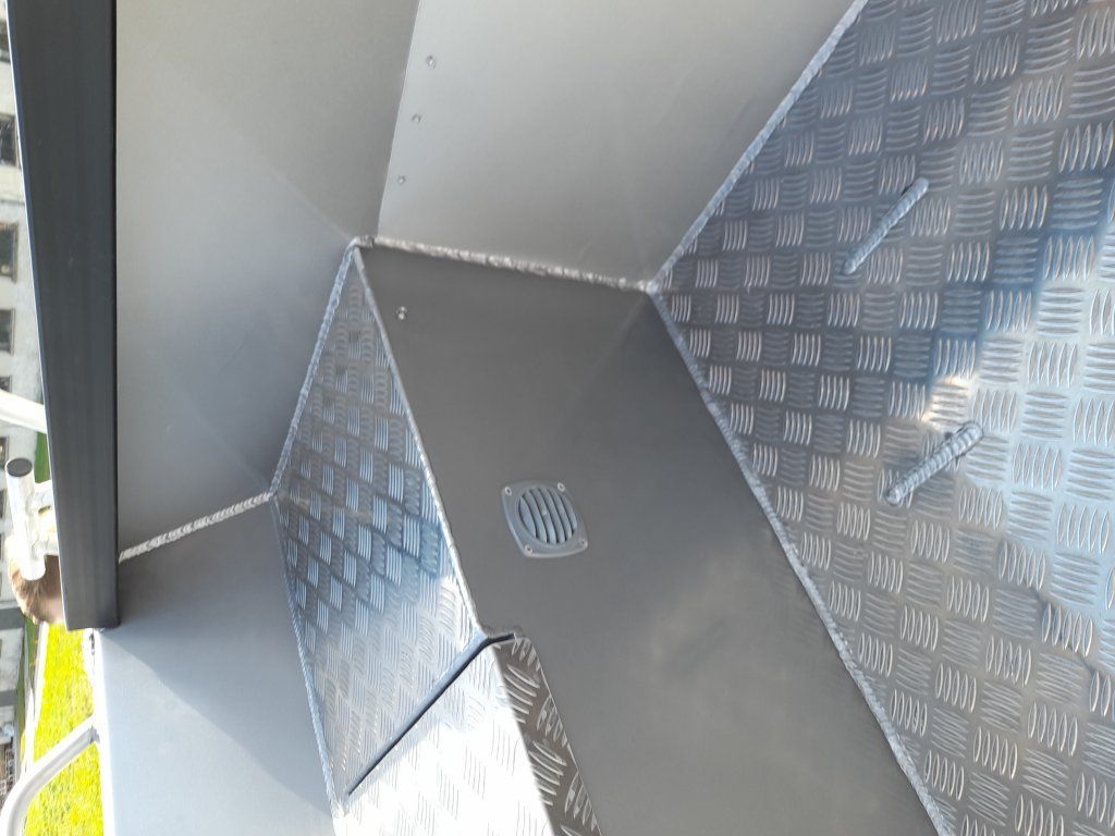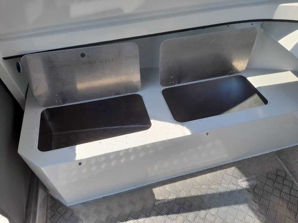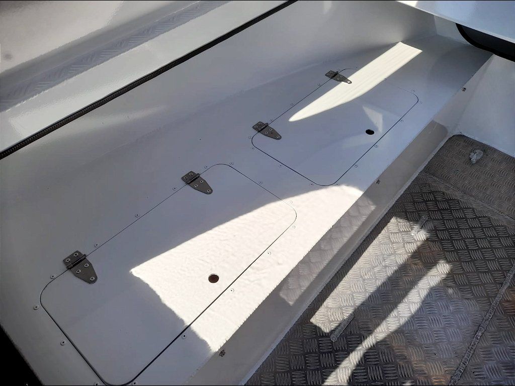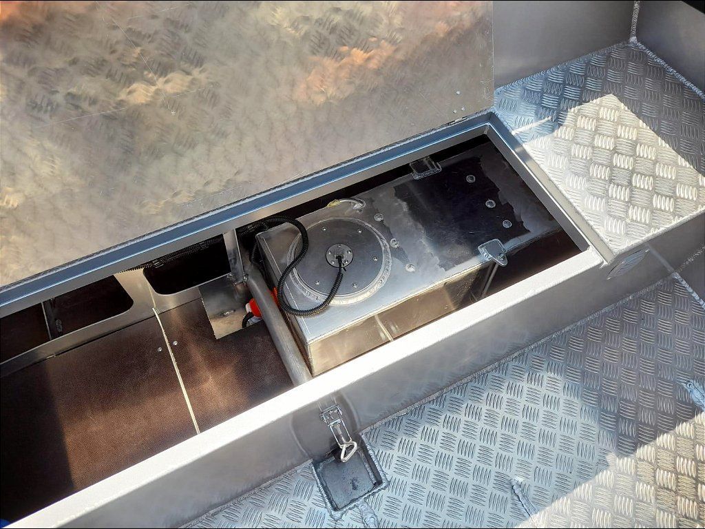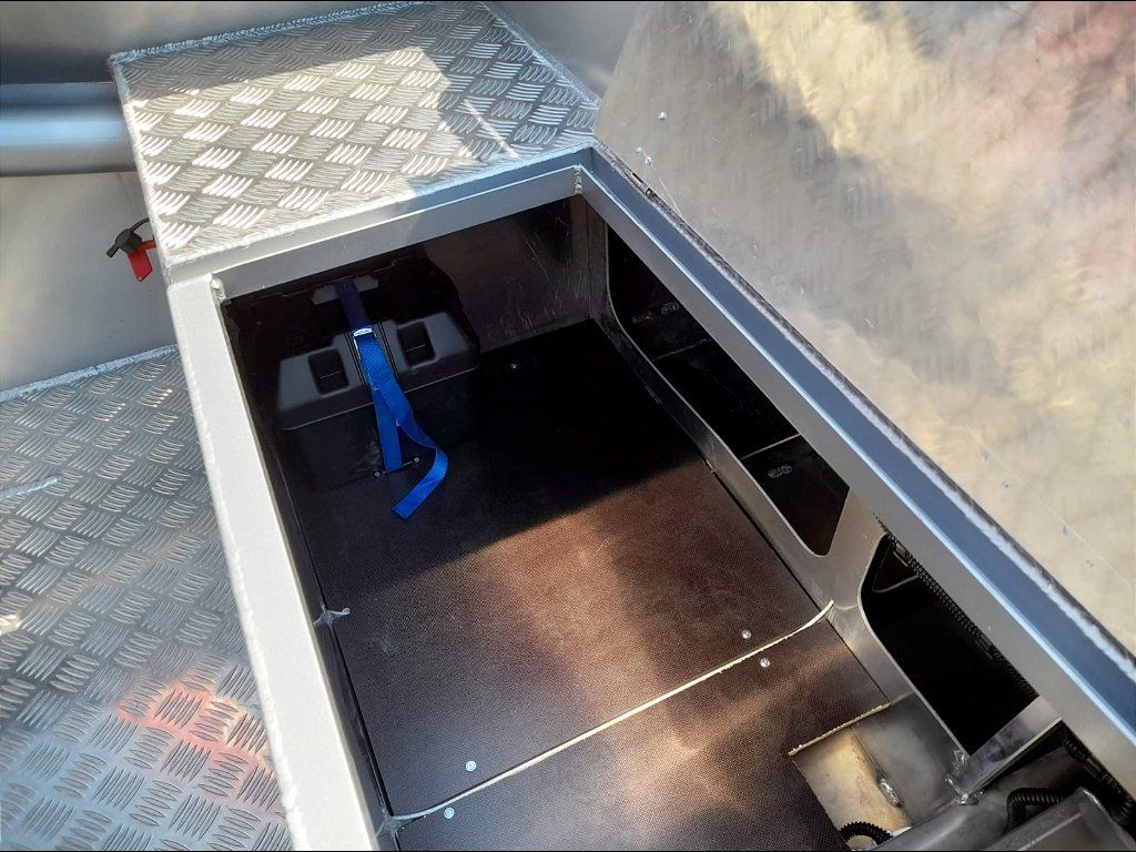 3. Achterbank mit grossem Stauraum, verschlossen mit Aluminium- klappe aus Riffelblech, mit belüftetem Platz für den Kraftstofftank